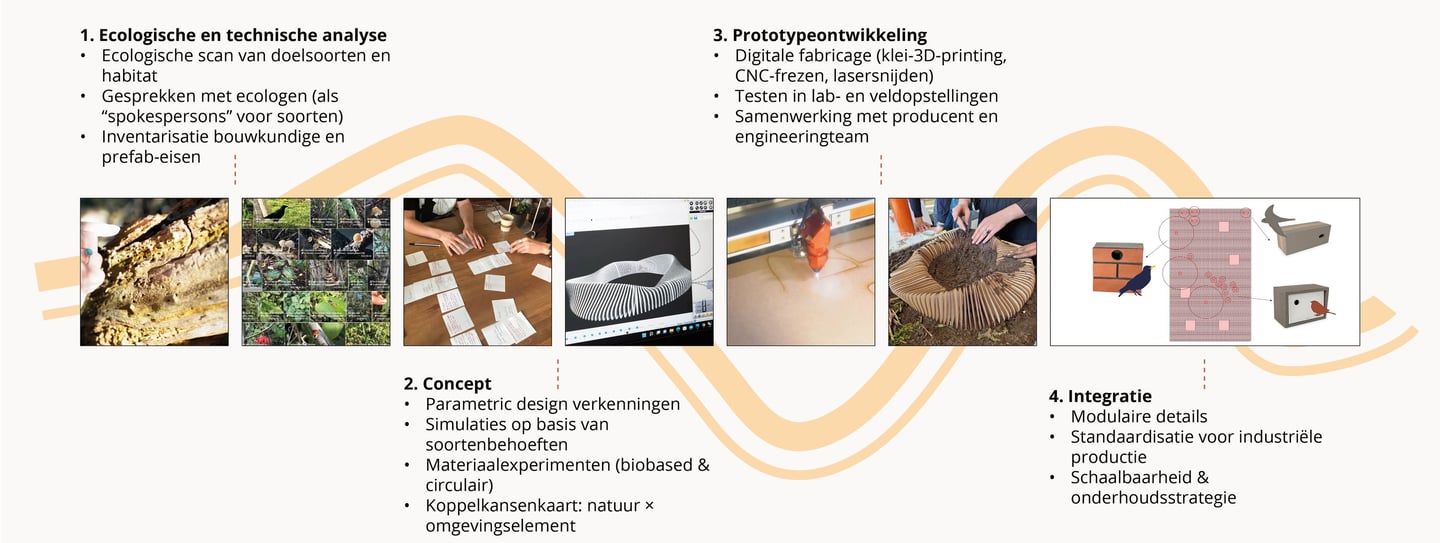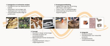 De ontwerpaanpak van Operatie Regeneratie combineert ecologie, ontwerp, materiaal en engineering in een iteratief traject. In elke fase wordt samengewerkt met producenten, ecologen en ingenieurs om ecologische waarde, maakbaarheid en opschaalbaarheid te waarborgen.